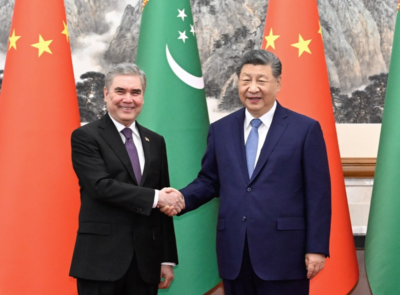 3月18日下午,国家主席习近平在北京钓鱼台国宾馆会见来华进行友好访问的土库曼斯坦民族领袖、人民委员会主席别尔德穆哈梅多夫。图片来源:新华网